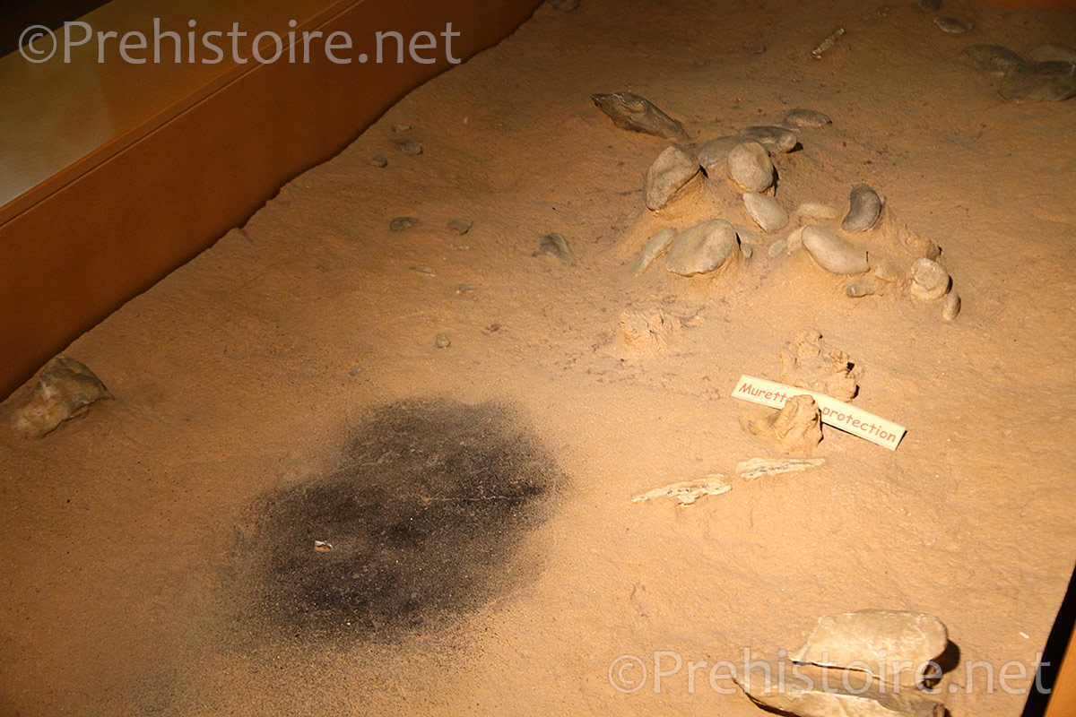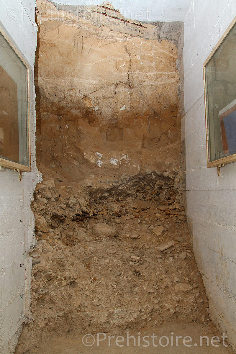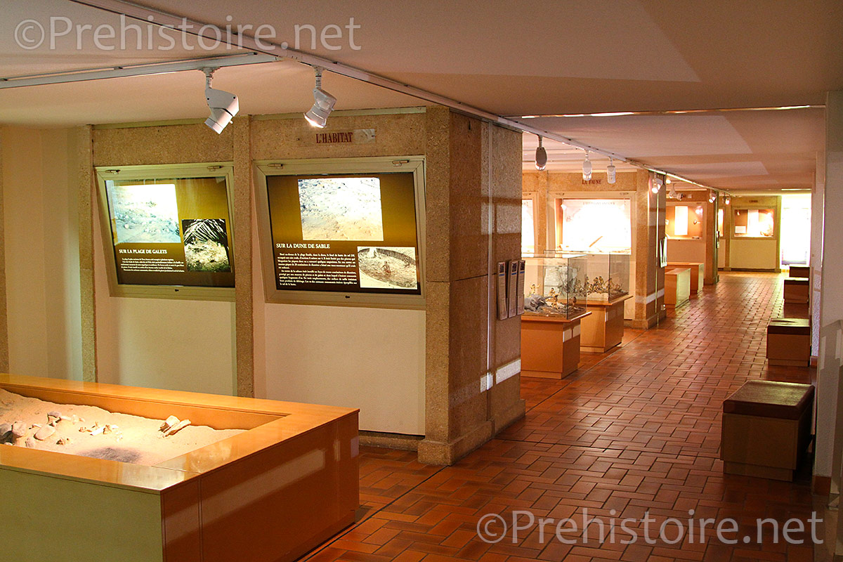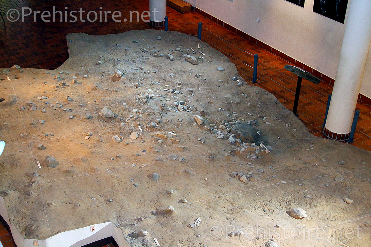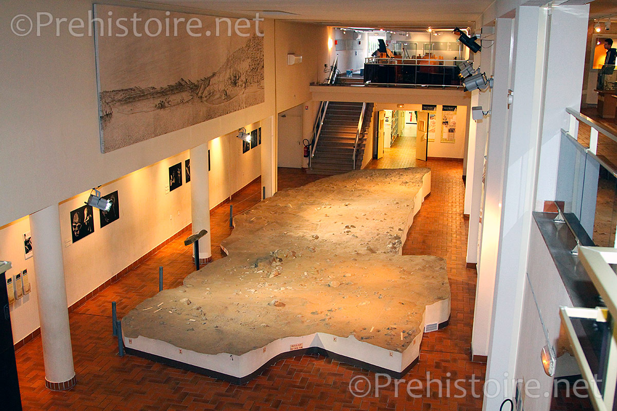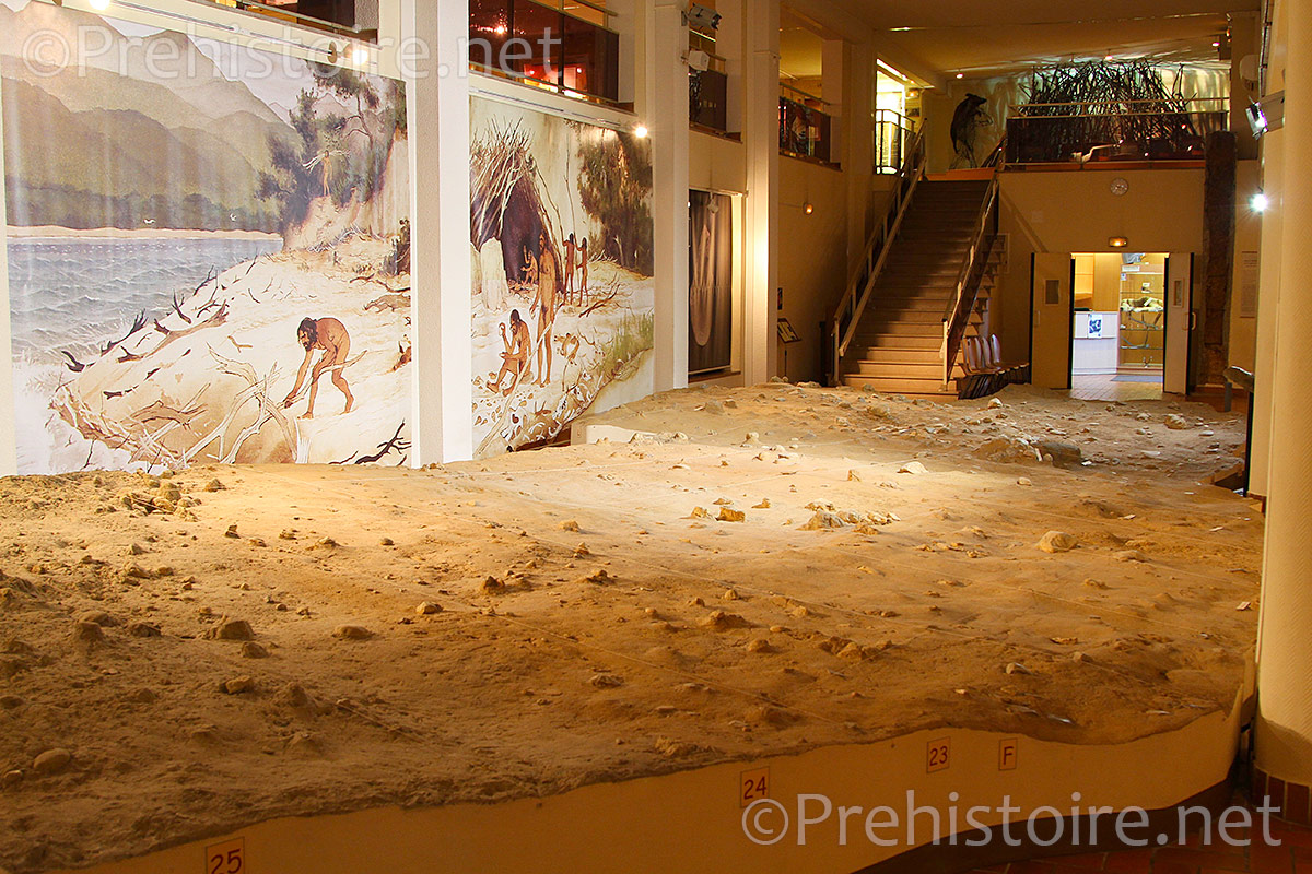 Le premier niveau, de plein pied, est consacré à une reproduction du site de Terra Amata « grandeur nature » tel qu’il a été fouillé. Vous pourrez y voir les traces laissées par le campement (les huttes), la taille d’outils, les foyers et les aménagements prévus pour protéger la flamme du vent (muret). C’est l’un des plus anciens foyers découverts en Europe.